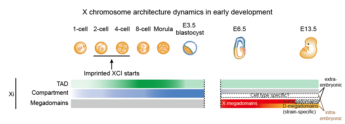 在哺乳动物中,雌性(XX)与雄性(XY)细胞具有性染色体二态性。为了平衡基因表达水平,在胚胎发育早期,雌性细胞内一条X染色体会发生转录失活(X chromosome inactivation, XCI)。X染色体失活异常,会引起严重的胚胎发育缺陷,多种人类智力缺陷疾病,甚至胚胎死亡。因此研究X染色体失活及其调控机制具有重要的科学意义和临床价值。X染色体失活伴随着剧烈的X染色质结构变化,最终呈现为凝缩的异染色质状态,被称为“巴氏小体”。 之前对体外小鼠胚胎干细胞(mESC)分化过程的研究发现,失活X染色体的拓扑结构域(TAD)和区室(compartment)结构都明显减弱,同时出现了以宏卫星序列Dxz4为边界的超级结构域(Dxz4-separated megadomains,D-megadomains)。颉伟实验室和合作者前期围绕染色体三维结构在哺乳动物生殖和胚胎发育过程中的变化规律和功能进行了一系列研究,包括精子发生(Wang et al., Mol Cell, 2019),卵子发生(Du et al., Mol Cell, 2020),着床前胚胎(Du et al., Nature, 2017),着床后胚胎(Zhang et al., Nat Genet, 2018; Xiang et al., Nat Genet, 2020)和核移植过程(Zhang et al., Mol Cell, 2020)等。然而,染色体三维结构在雌性胚胎发育早期X染色体失活过程中的动态变化过程、机制和功能仍不清楚。